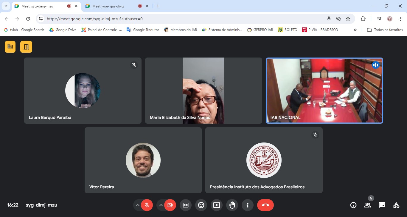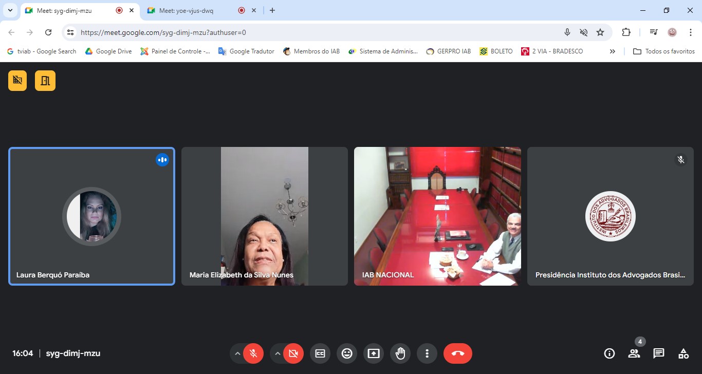 Comissão de Direito e Liberdade Religiosa-IAB/Nacional, Reunida no Formato Híbrido, em 26.06.2024, as 16h07, à Partir da Sede do IAB/Nacional, Av. Marechal Câmara, 210, 5º Andar, Centro, Rio/RJ, Concomitantemente, Através da Plataforma ‘Google Meet’ Disponibilizada pela Setor de Tecnológica do IAB, sob a Presidência do Dr. Gilberto Garcia, e, Contando com a Participação Presencial do Dr. Luiz Henrique de Oliveira Junior, e Eletrônica dos Membros: Dr. Vitor Pimentel Pereira, Dra. Maria Elizabeth da Silva Nunes; e, a Dra. Laura Berquó (João Pessoa/PB);, Anotando-se a Justificativa de Ausência do Dr. Luiz Claudio Gonçalves Junior (Guaratinguetá/SP); tendo sido Apreciados os Itens da Pauta, pelos Membros Presentes na Reunião: 003/2024, Bimensal Híbrida, deste dia: