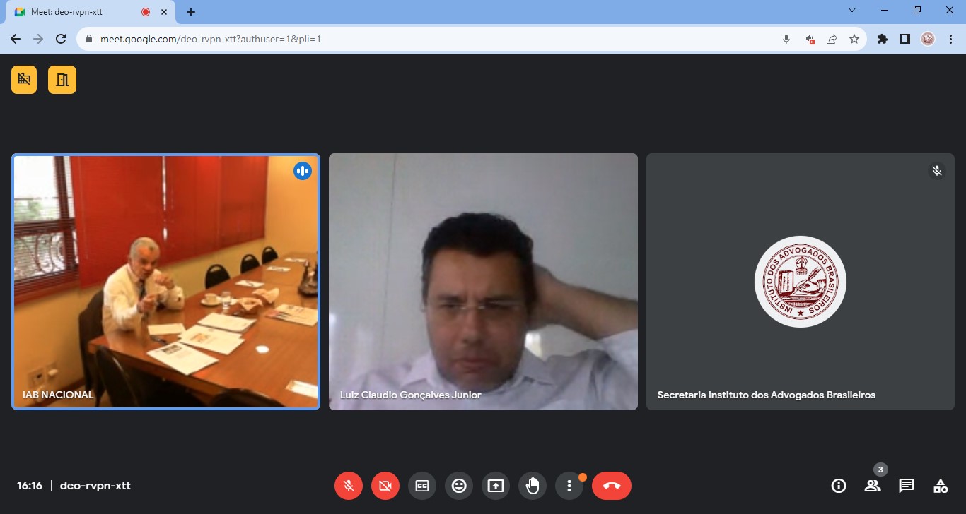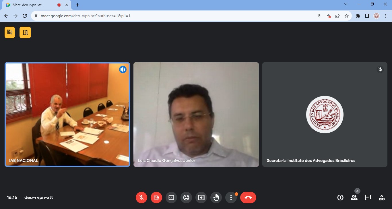 A Comissão de Direito e Liberdade Religiosa-IAB/Nacional reunida hibridamente, em 13.12.2023, as 16h10, à partir da Biblioteca do IAB/Nacional, na Av. Marechal Câmara, 210, 2º Andar, Centro, Rio/RJ, concomitantemente, através da Plataforma ‘Google Meet’ disponibilizada pela Liderança Tecnológica do IAB, sob a Presidência do Dr. Gilberto Garcia, e Contando com a Participação Eletrônica dos Membros: Dr. Luiz Claudio Gonçalves Junior (Guaratinguetá/SP); Anotando a Justificativa de Ausência do Dr. João Theotonio Mendes de Almeida Junior (2º Vice-Presidente), tendo sido Apreciados os Itens da Pauta, pelos Membros Presentes na Reunião: 007/2023, Bimensal Híbrida, (Presencial e On-Line), deste dia: