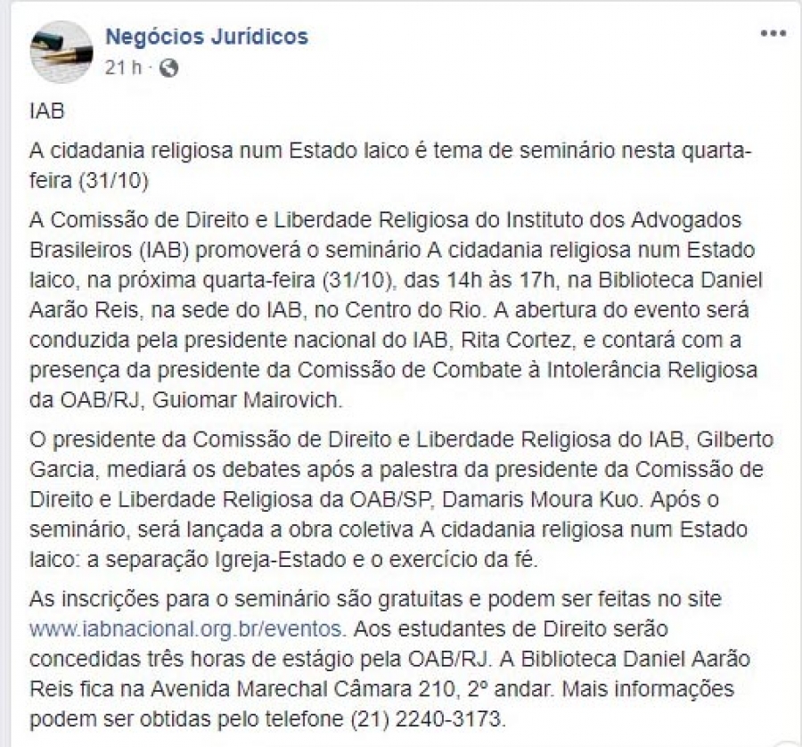 A cidadania religiosa num Estado laico é tema de seminário no IAB, na quarta-feira (31/10)