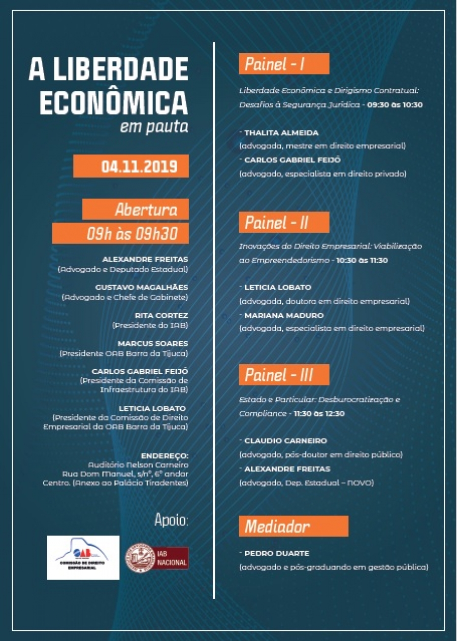 Dia 04 de novembro de 20219, das 09h às 12h30 - Local: Auditório Nelson Carneiro, Rua Dom Manuel, s/nº, 6º andar, centro - Rio de Janeiro - RJ.
