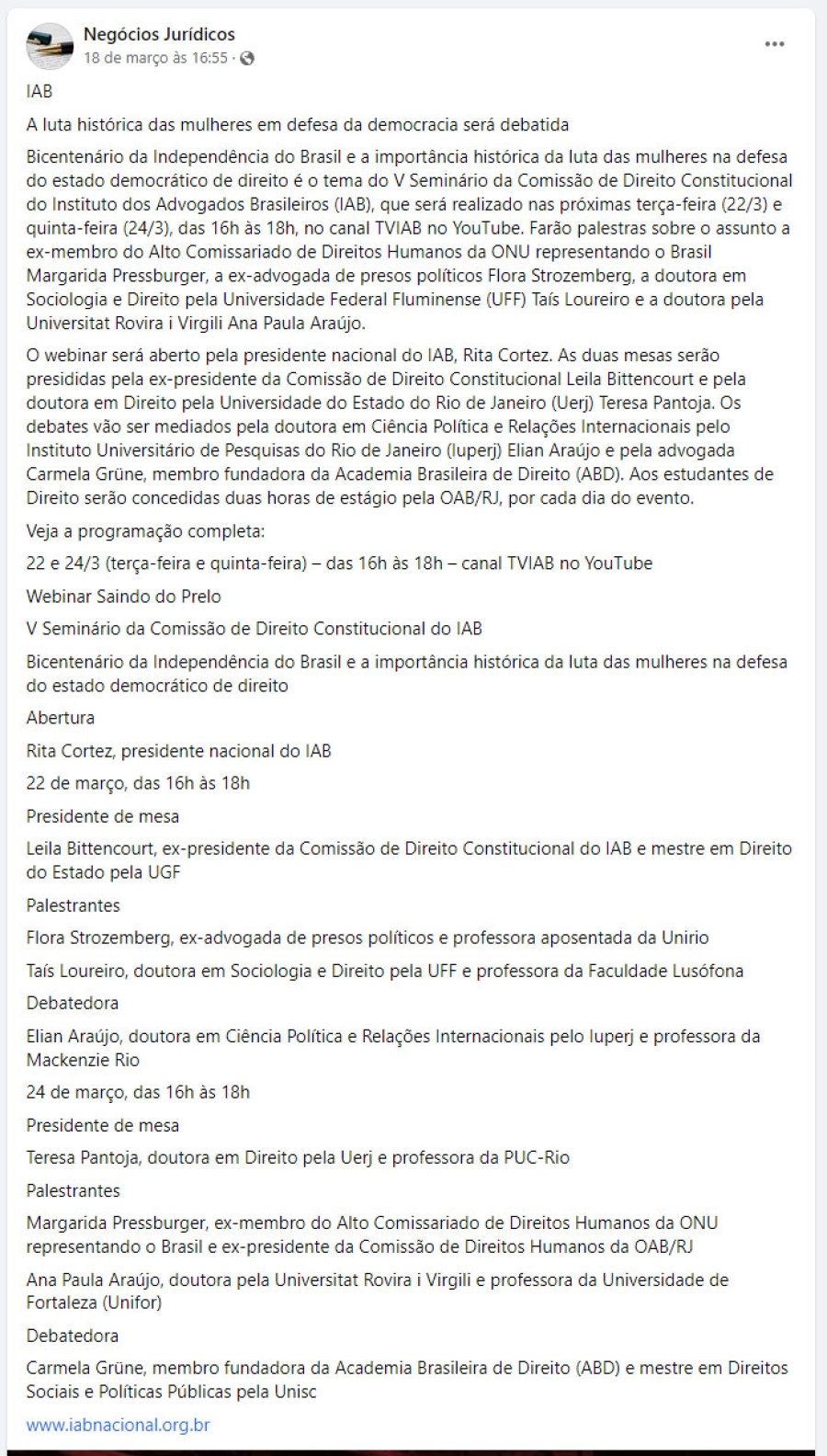 A luta histórica das mulheres em defesa da democracia será debatida no canal TVIAB