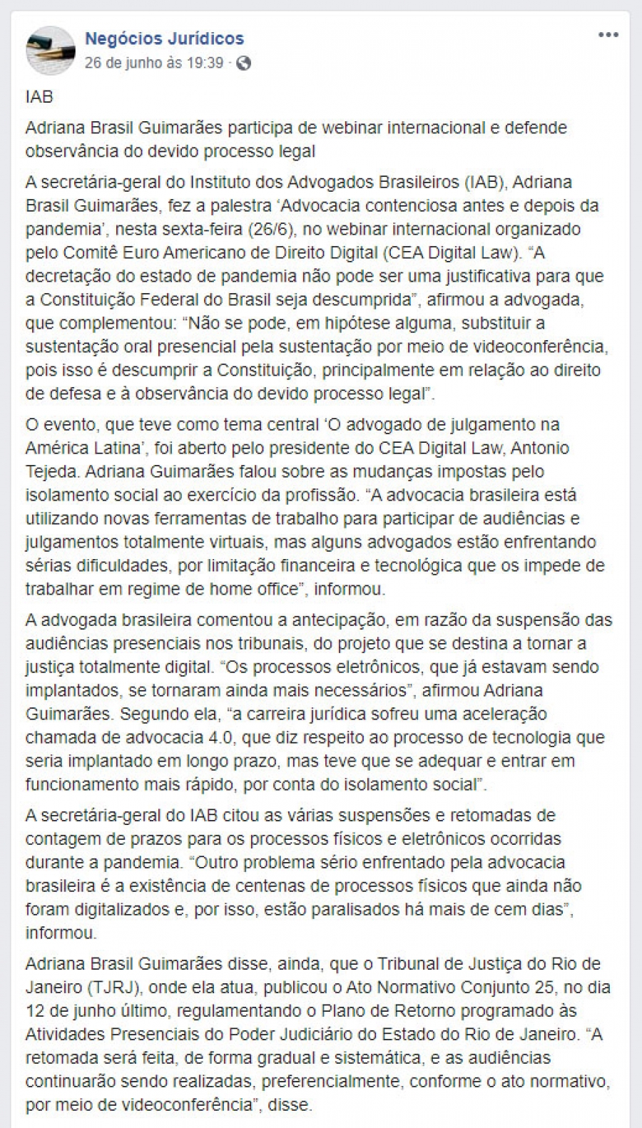 Adriana Brasil Guimarães participar de webinar internacional e defende observância do devido processo legal