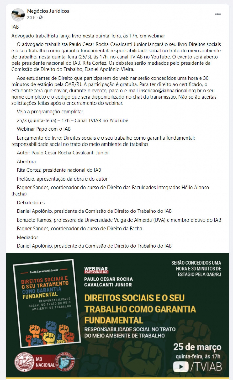 Advogado trabalhista lança livro nesta quinta-feira, às 17h, no webinar Papo com o IAB