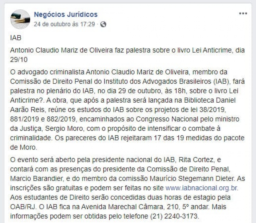 Antonio Claudio Mariz de Oliveira faz palestra sobre o livro Lei Anticrime?. dia 29/10/2019
