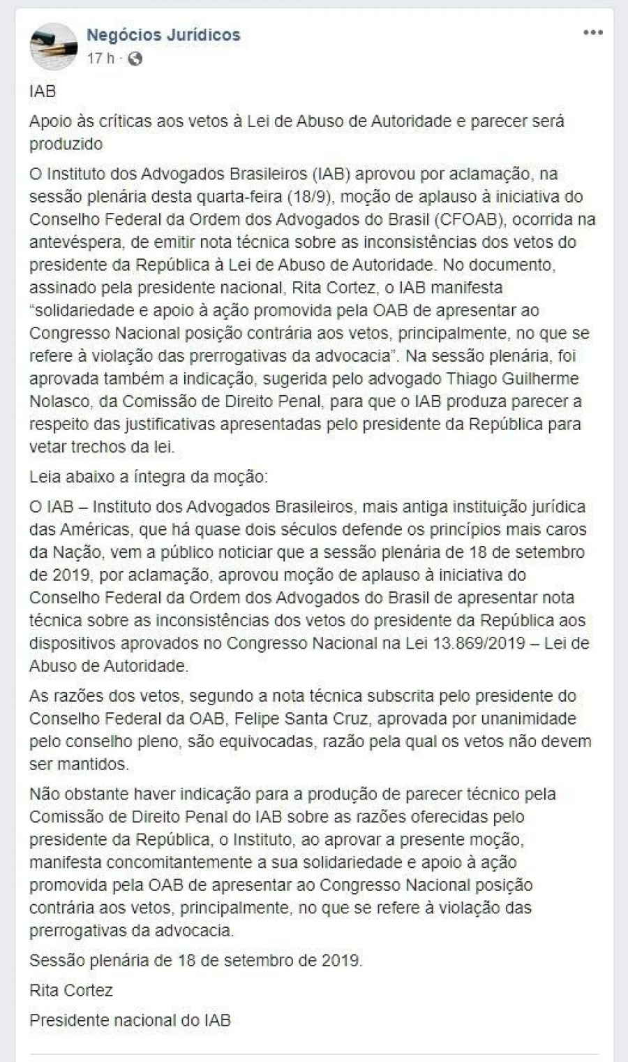 Apoio às críticas aos vetos à Lei de Abuso de Autoridade e parecer