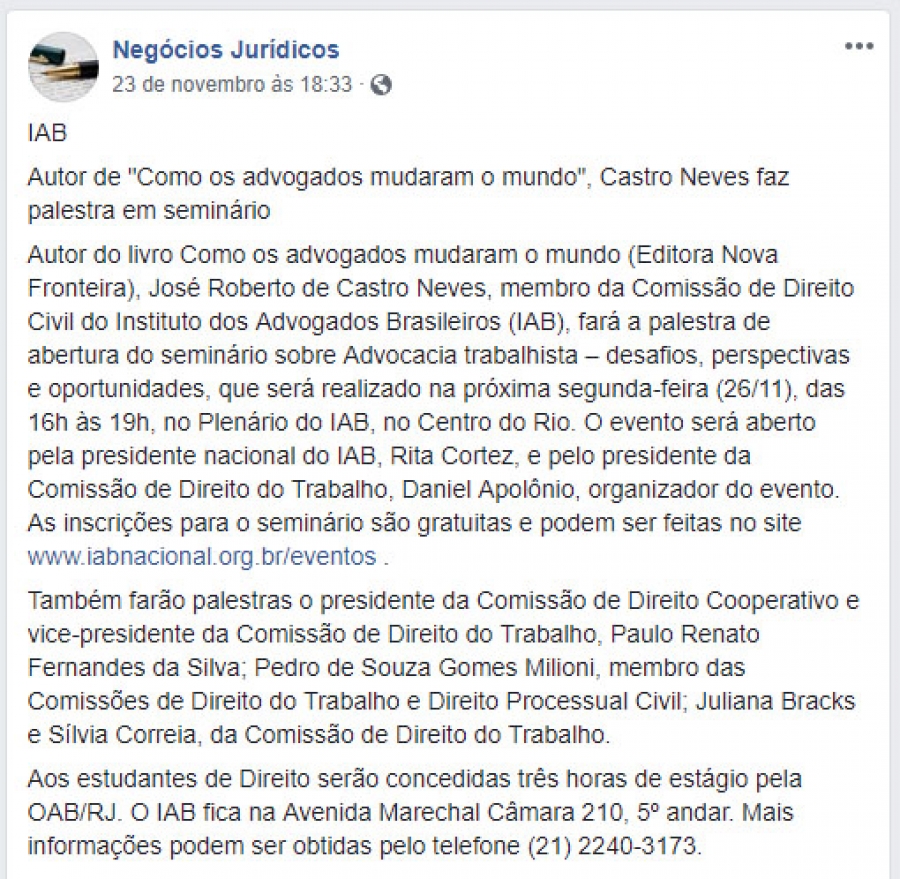 Autor de "Como os advogados mudaram o mundo", Castro Neves faz palestra em seminário