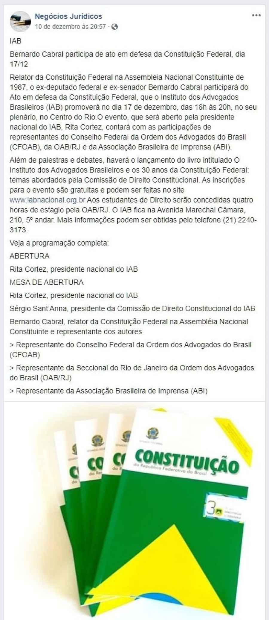 Bernardo Cabral participa no IAB de ato em defesa da Constituição Federal