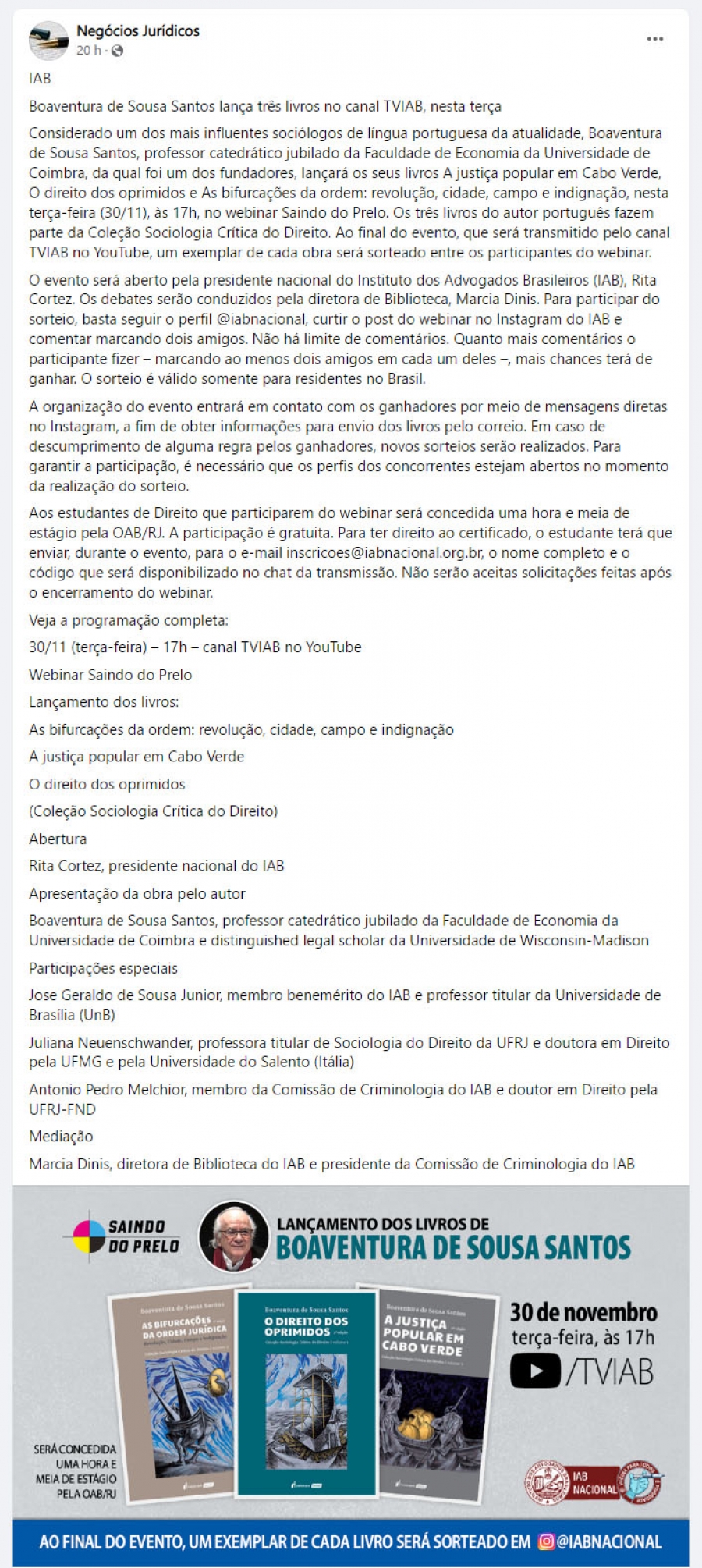Boaventura de Sousa Santos lança três livros no canal TVIAB, nesta terça