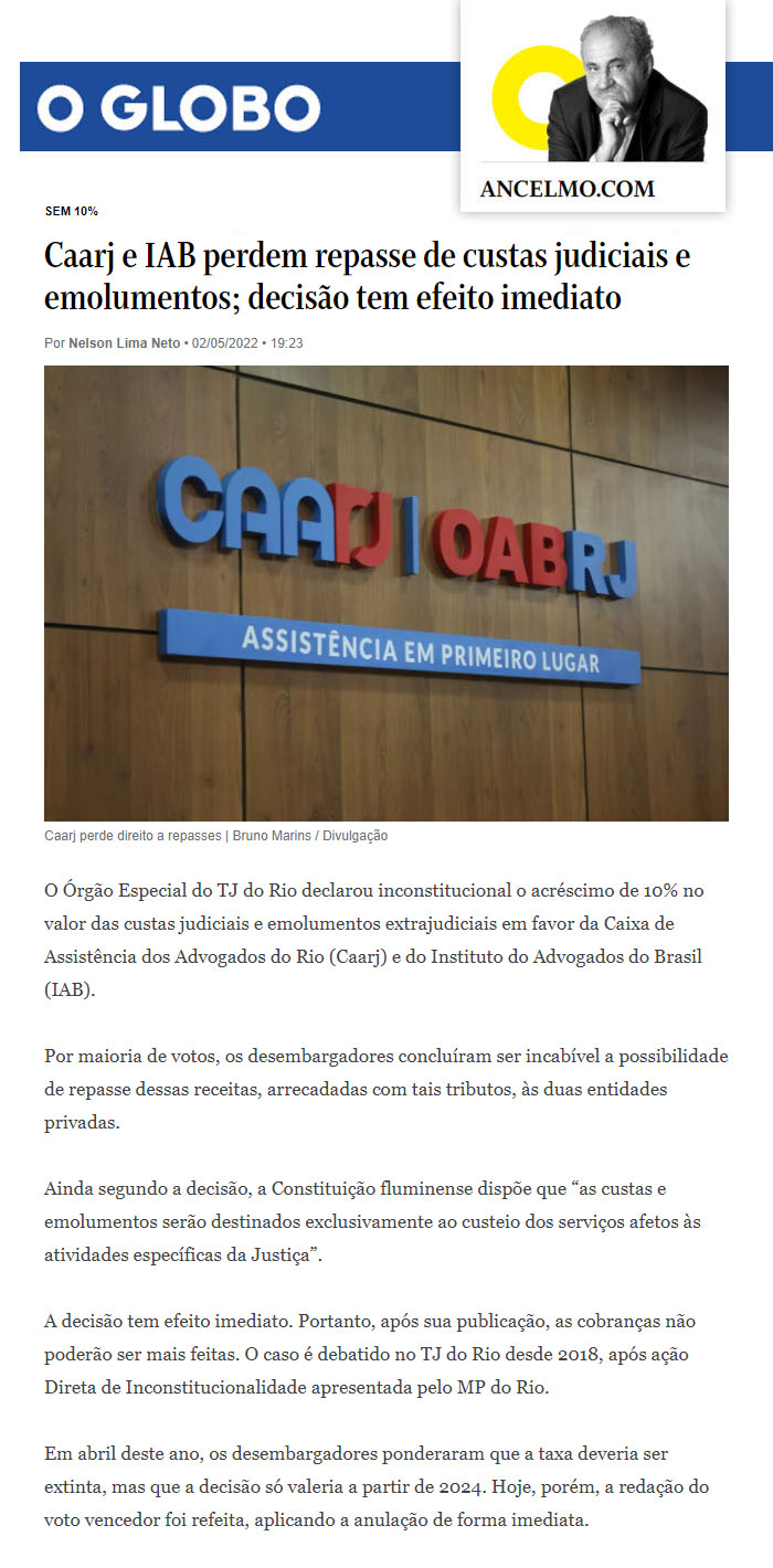 Caarj e IAB perdem repasse de custas judiciais e emolumentos
