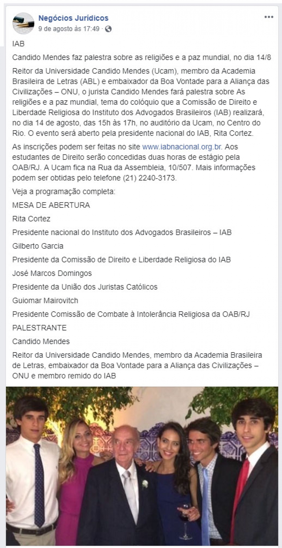 Candido Mendes faz palestra sobre as religiões e a paz mundial, dia 14/8