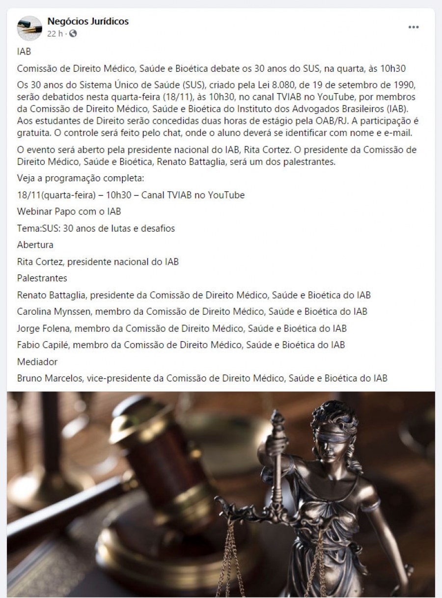 Comissão de Direito Médico, Saúde e Bioética do IAB debate os 30 anos do SUS, nesta quarta