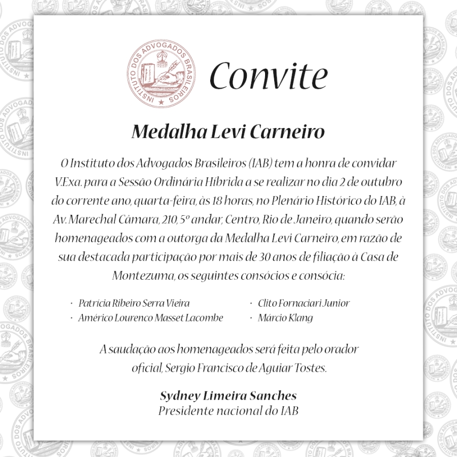 O IAB - Institudo dos Advogados Brasileiros tem a honra de convidar V. Exa. para a Sessão Ordinária híbrida a se realizar no dia 02 de outubro do corrente ano , quarta-feira às 18 horas , no Plenário Histórico do IAB, à Avenida Marechal Câmara, 210 , 5º andar, Centro, Rio de Janeiro, quando serão homenageados com a outorga da Medalha Levi Carneiro , em razão de sua destacada participação por mais de 30 anos de filiação à casa de Montezuma, os seguintes consócios e consócia: