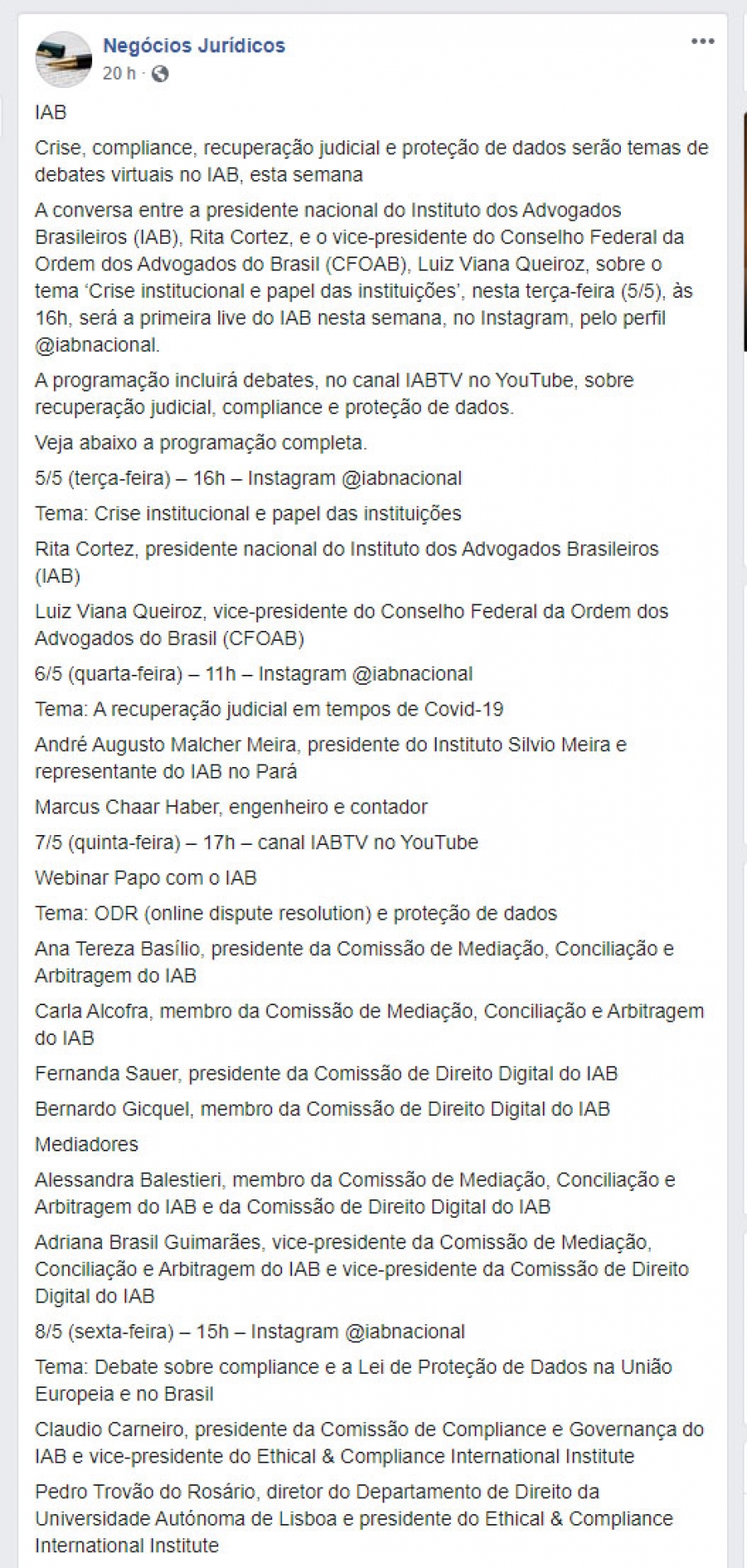 Crise, compliance, recuperação judicial e proteção de dados serão temas de debates virtuais no IAB, esta semana