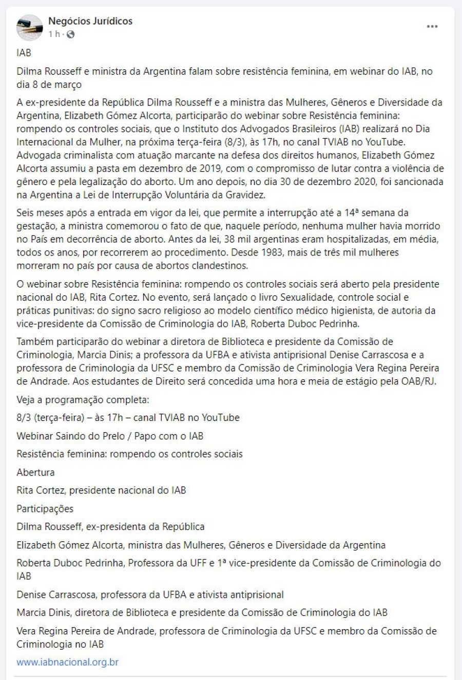 Dilma Rousseff e ministra da Argentina falam sobre resistência feminina, em webinar do IAB, nesta terça