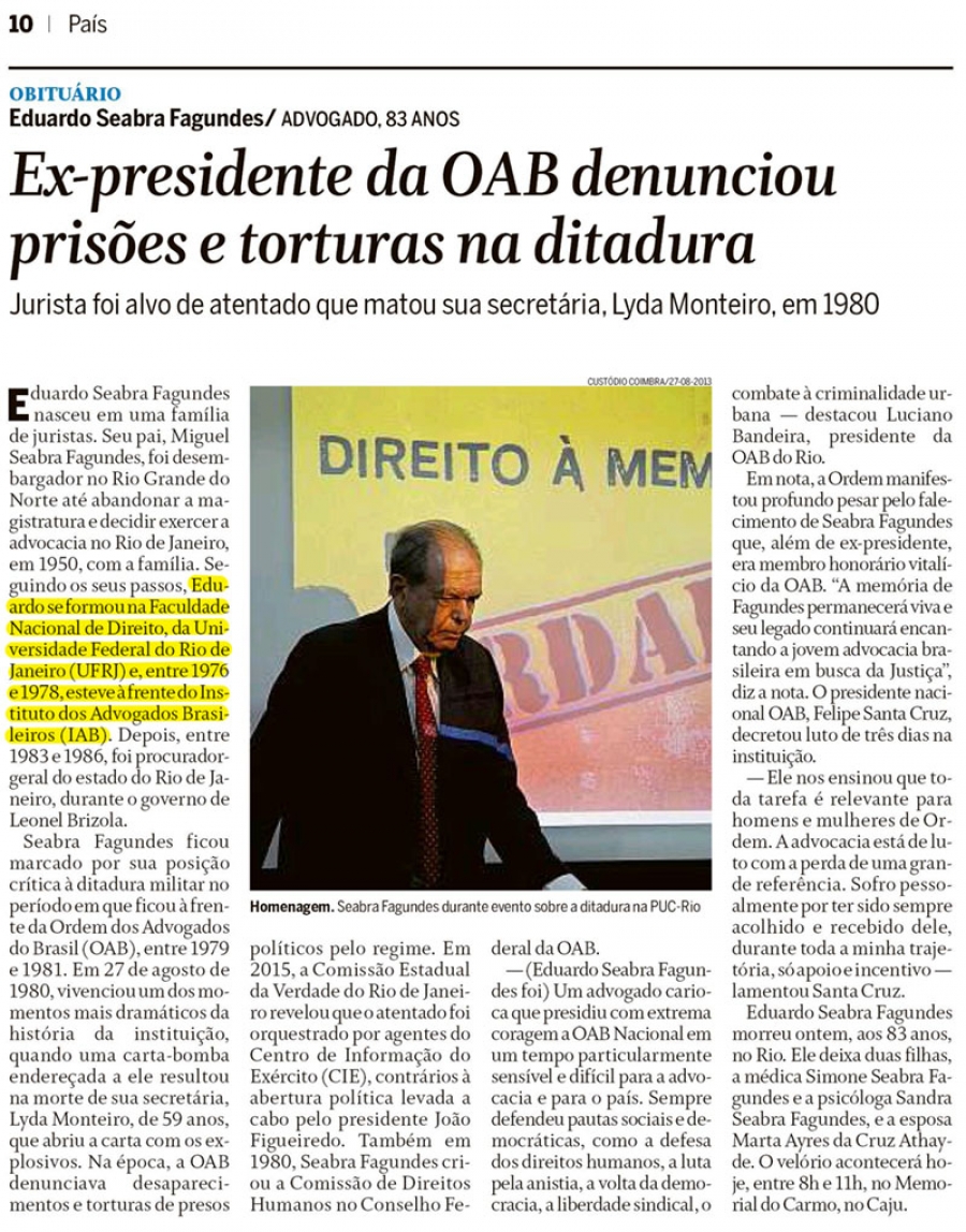 Ex-presidente da OAB denunciou prisões e torturas na ditadura