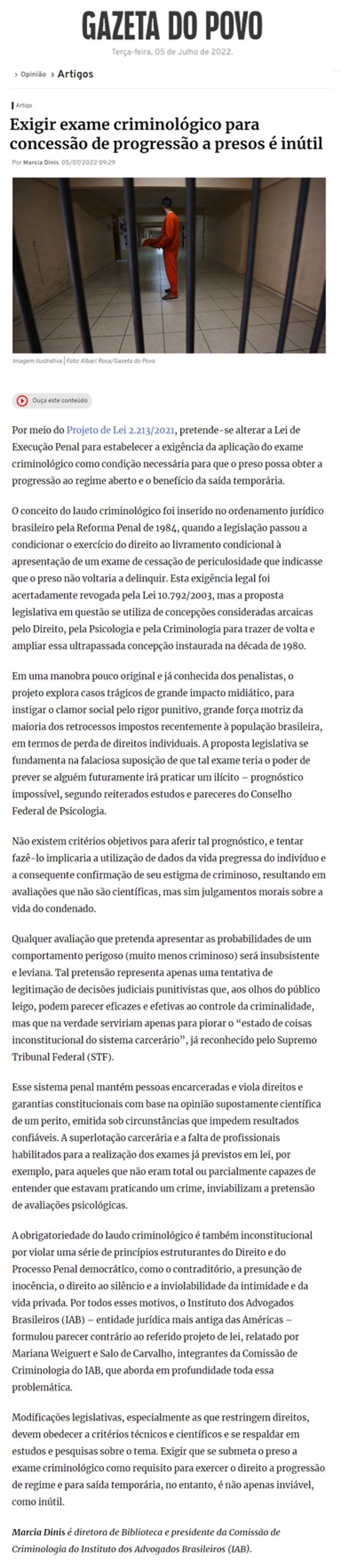 Exigir exame criminológico para concessão de progressão a presos é inútil