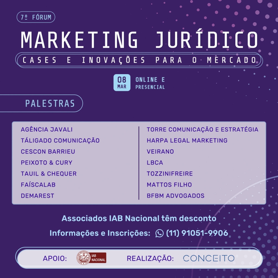 O Fórum Marketing Jurídico chega em sua 7ª edição em formato inovador: será híbrido no dia 8 de março, presencial, em São Paulo, e online com transmissão ao vivo.