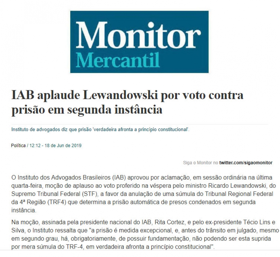 IAB aplaude Lewandowski por voto contra prisão em segunda instância