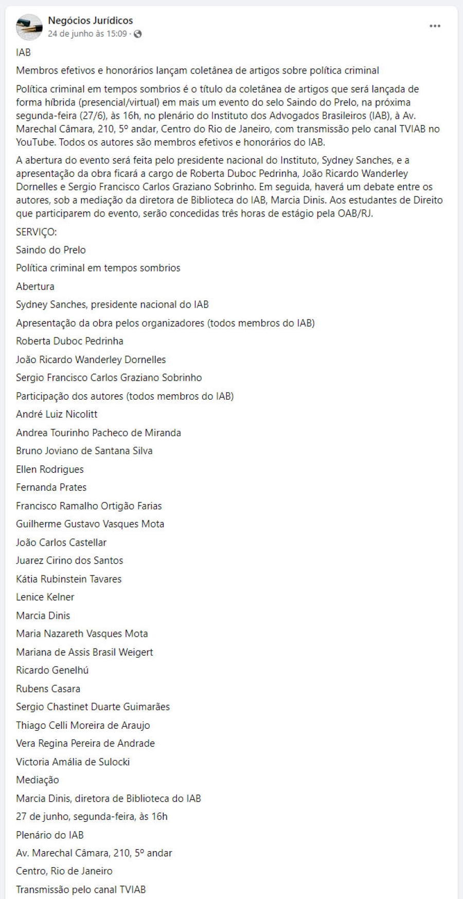 IAB - Membros efetivos e honorários lançam coletânea de arquivos sobre política criminal