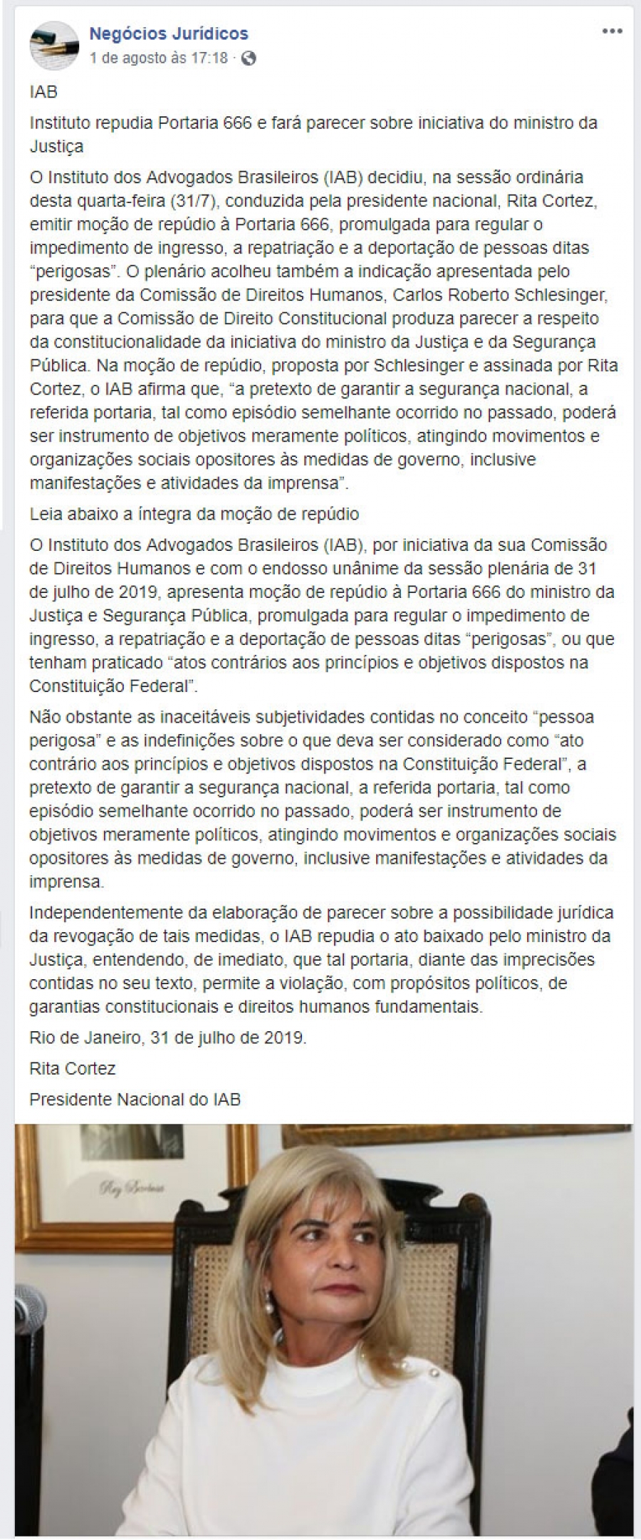 Instituto repudia Portaria 666 e fará parecer sobre iniciativa do ministro da Justiça