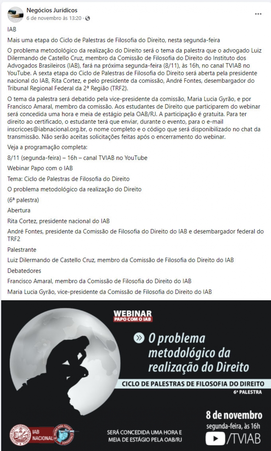 Mais uma etapa do Ciclo de Palestras de Filosofia do Direito, nesta segunda-feira