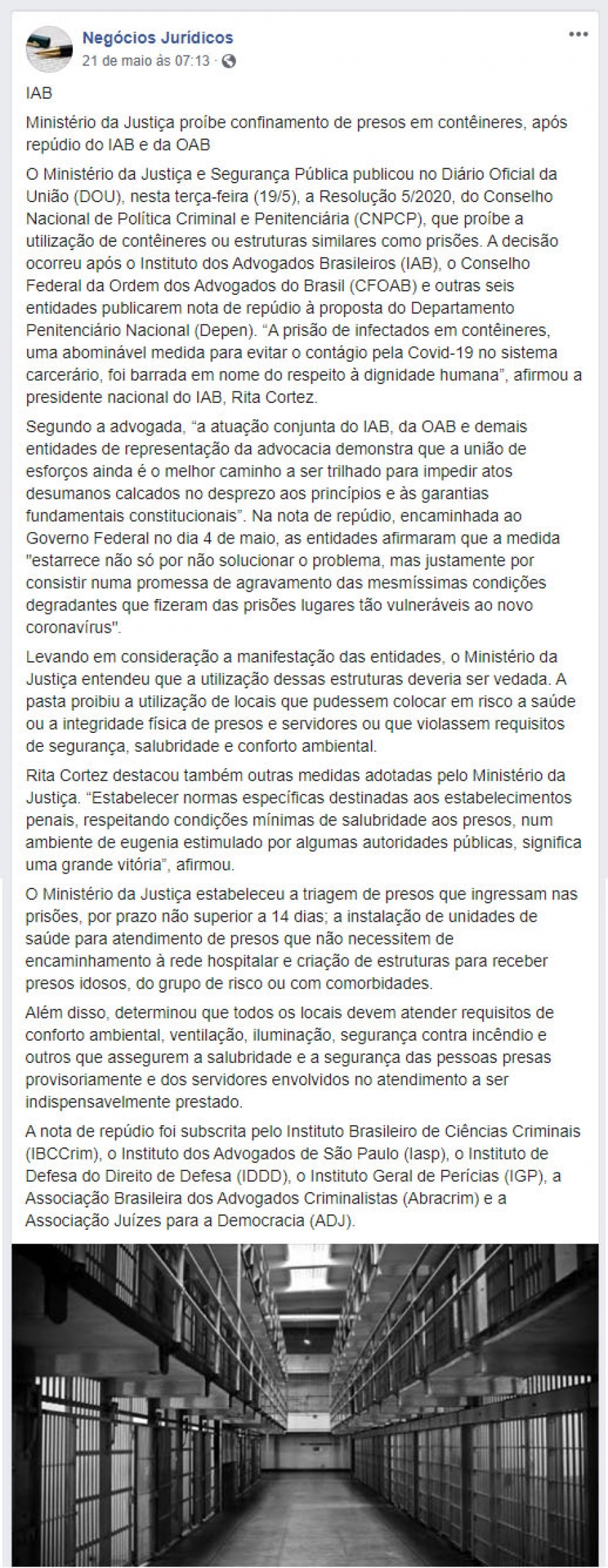 Ministério da Justiça proíbe confinamento de presos em contêineres, após repúdio do IAB e da OAB