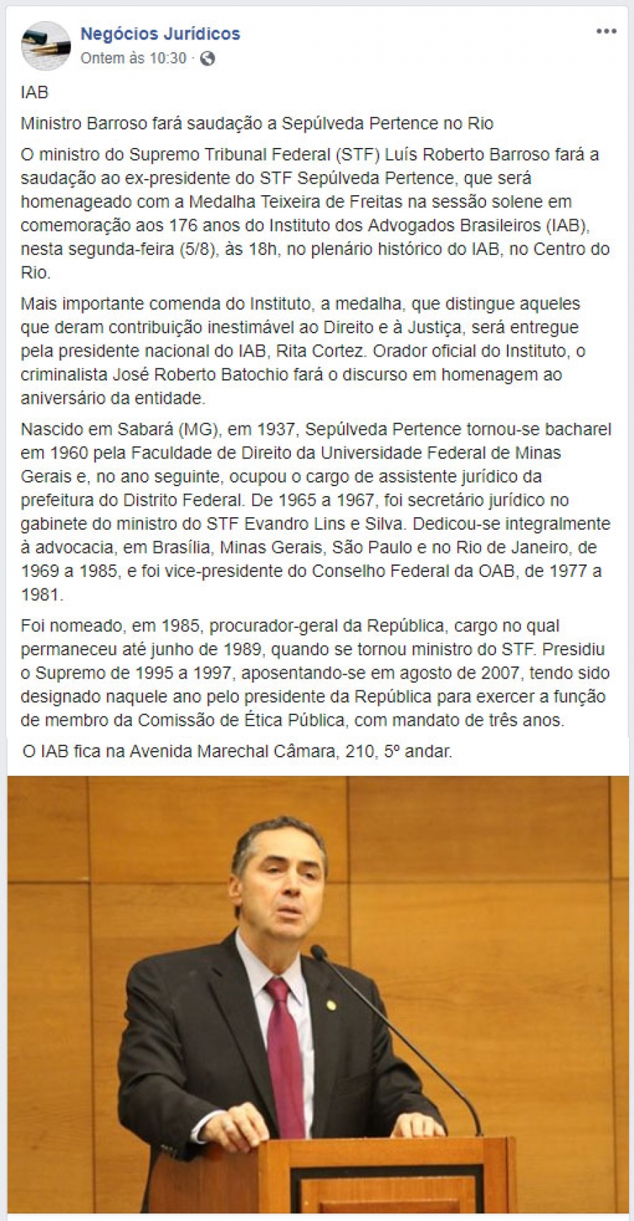 Ministro Barroso fará saudação a Sepúlveda Pertence no Rio