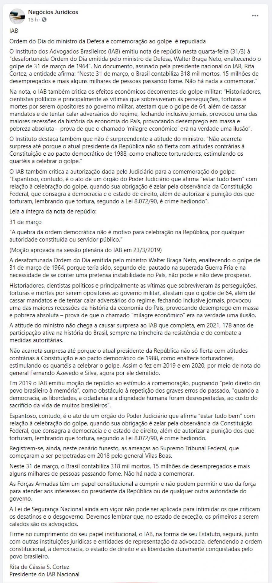 Ordem do Dia do ministro da Defesa e comemoração ao golpe são repudiados