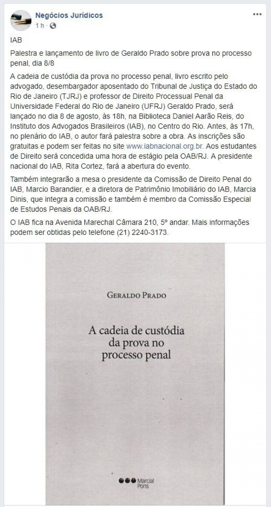 Palestra e lançamento de livro de Geraldo Prado sobre prova no processo penal, dia 8/8