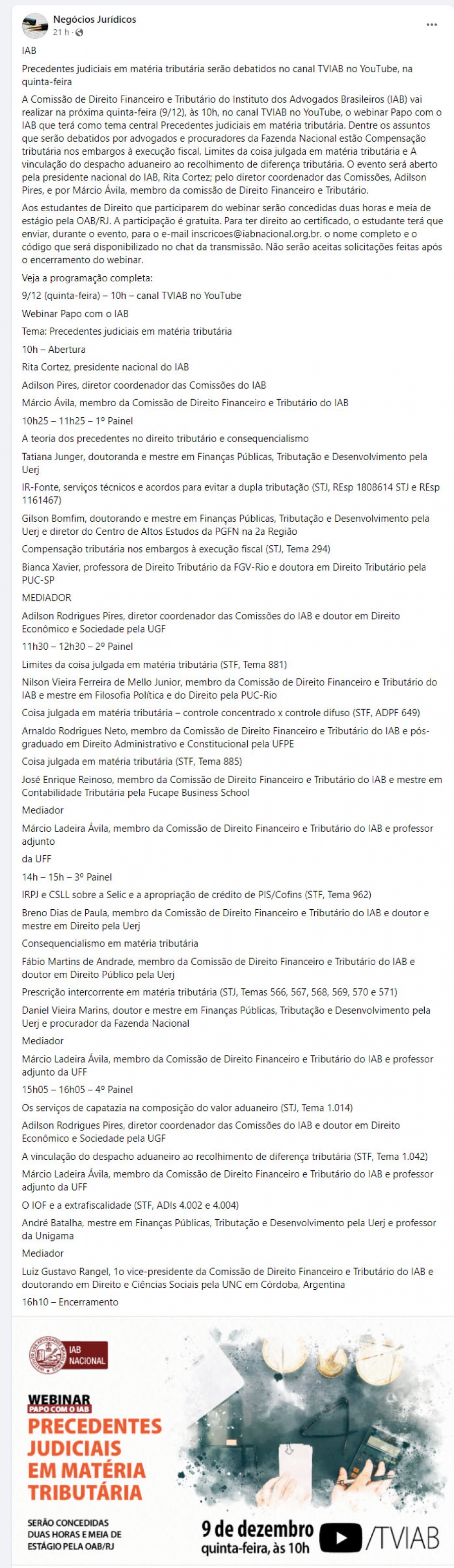 Precedentes judiciais em matéria tributária serão debatidos no canal TVIAB no YouTube