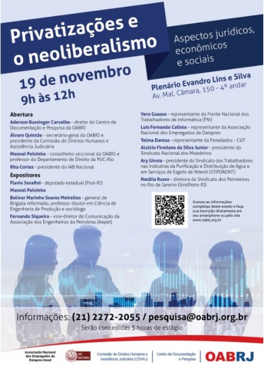 Dia 19 de novembro de 2019, das 09h às 12h - Local: OAB-RJ - Av. Marechal Câmara nº 150, 4º andar, Plenário Evandro Lins e Silva - Centro - Rio de Janeiro - RJ.