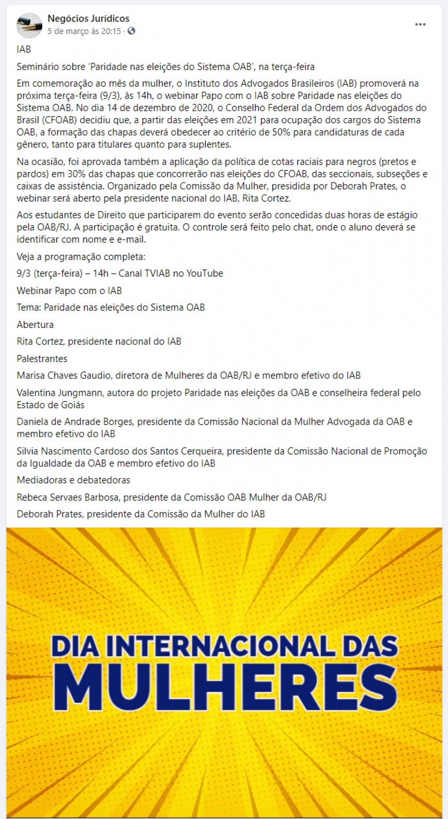 Seminário sobre 'Paridade nas eleições do Sistema OAB', na terça-feira