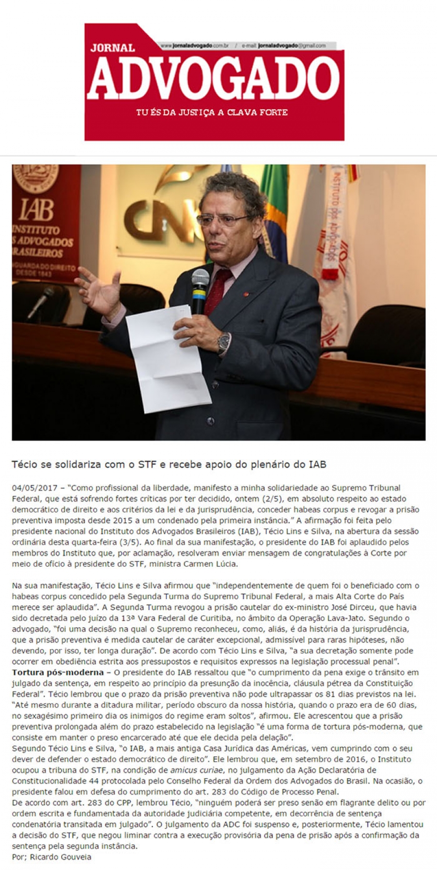 Técio se solidariza com o STF e recebe apoio do plenário do IAB