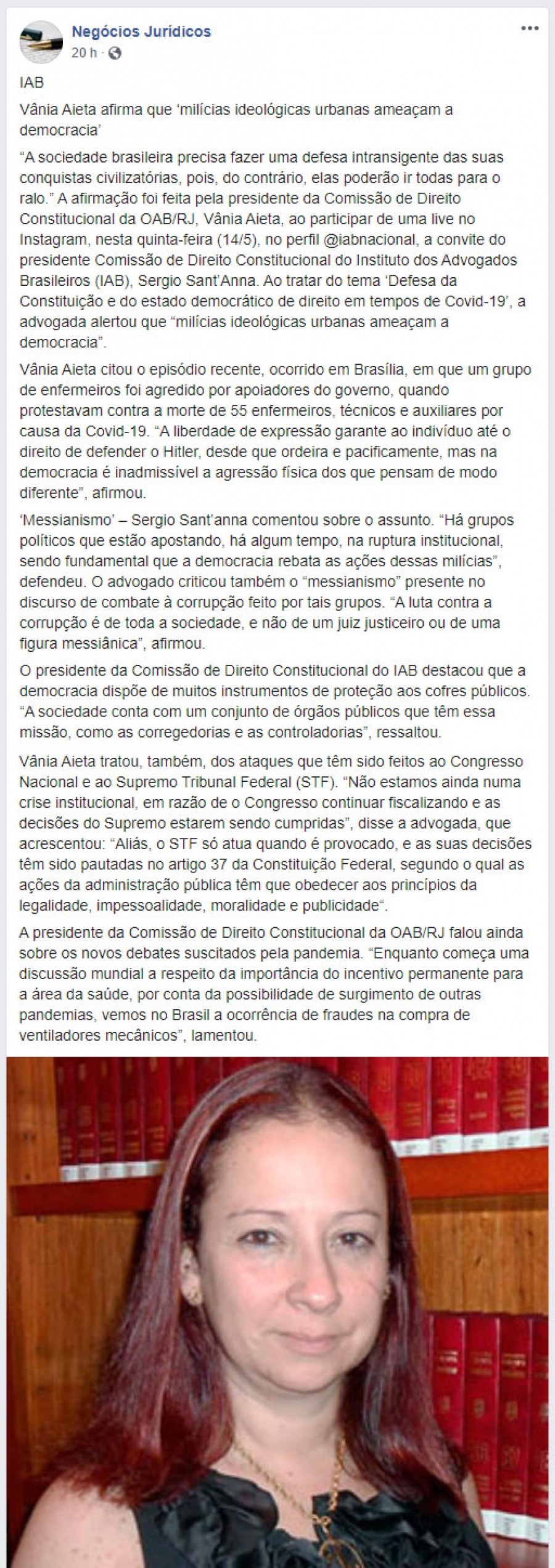 Vânia Aieta afirma que ‘milícias ideológicas urbanas ameaçam a democracia’