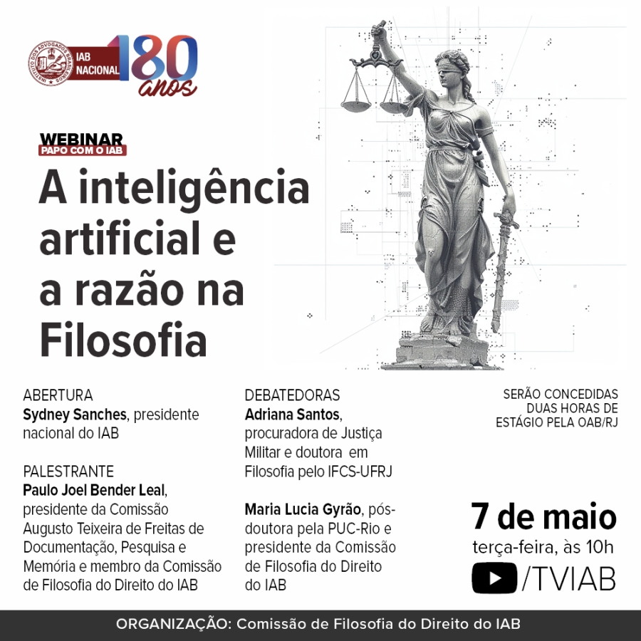 A presidente da Comissão de Filosofia do Direito do IAB, Maria Lucia Gyrão, e a procuradora de Justiça Militar e doutora em Filosofia pelo Instituto de Filosofia e Ciências Sociais da Universidade Federal do Rio de Janeiro (IFCS-UFRJ) Adriana Santos serão as debatedoras. Os estudantes de Direito que assistirem ao evento receberão duas horas de estágio pela OAB/RJ.