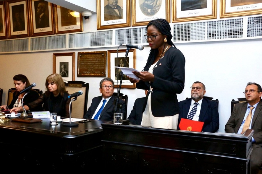 No seu pronunciamento, Janaína Muniz da Silva disse: “A chegada desta jovem baiana a esta Casa quase bicentenária é uma homenagem às milhares de mulheres negras que ajudaram a construir este País, entre elas, a Dra. Altamira Muniz, minha mãe e advogada, aqui presente”. A nova consócia falou de seu trabalho na OAB/BA e nas universidades em defesa da educação. “Ninguém pode ser privado dos seus direitos, por desconhecê-los”, afirmou a advogada, que complementou: “A educação é a única forma de aproximar o Direito daqueles que dele necessitam”. Altamira Muniz, Janaína Muniz da Silva e Angela Mendes