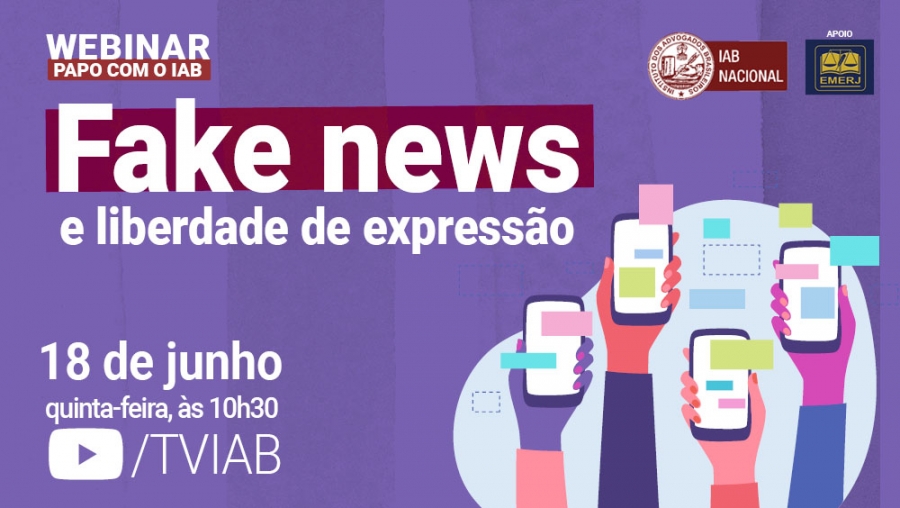 Card com fundo roxo contendo o título do evento, onde o termo 'Fake news' está em destaque. Há uma ilustração de mãos erguendo seus celulares, de onde parecem sair caixas com mensagens e notícias. No alto, as logomarcas do Institudo dos Advogados Brasileiros e da Escola da Magistratura do Estado do Rio de Janeiro, que apoia a realização do evento. Há também informações sobre a transmissão pelo canal TVIAB no YouTube.