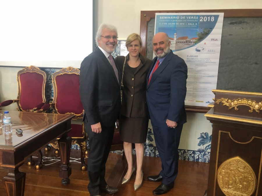 O secretário-geral, Carlos Eduardo Machado, e a diretora-secretária Ana Tereza Basílio representaram o Instituto dos Advogados Brasileiros (IAB), nesta segunda-feira (2/7), na abertura do Seminário de Verão 2018, que está sendo realizado na Faculdade de Direito da Universidade de Coimbra (Portugal), fundada em 1290. Organizado pela Associação de Estudos Europeus de Coimbra (Aeec) e pelo Instituto de Pesquisas e Estudos Jurídicos Avançados (Ipeja), com sede em Brasília, o seminário, que termina nesta terça-feira (3/7), tem como tema central Cidadania num mundo em transição. O presidente da Comissão de Direito do Comércio Internacional do IAB, Márcio Fernandes, também compareceu ao evento.