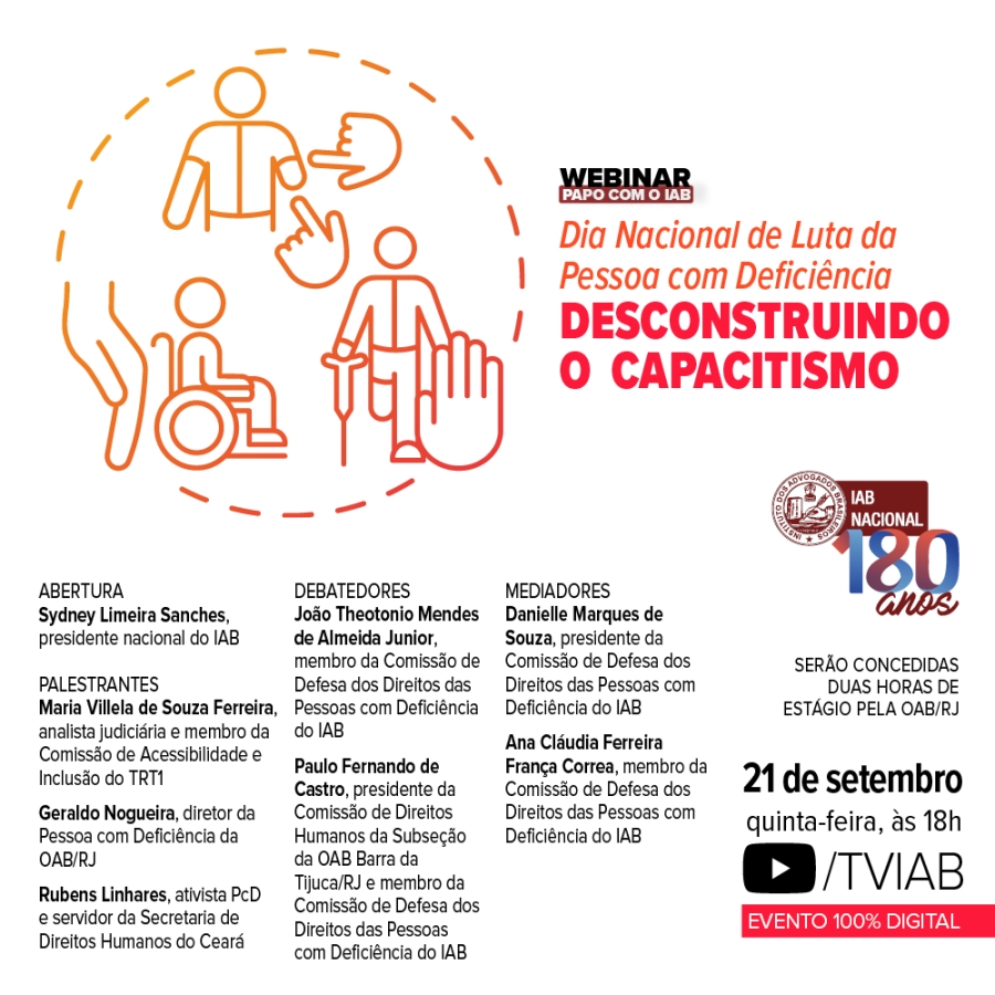 O membro da Comissão de Defesa dos Direitos das Pessoas com Deficiência do IAB João Theotonio Mendes de Almeida Junior e o presidente da Comissão de Direitos Humanos da Subseção da OAB Barra da Tijuca/RJ, Paulo Fernando de Castro, serão os debatedores do webinar. A mesa de trabalhos também terá a participação da presidente da Comissão de Defesa dos Direitos das Pessoas com Deficiência do IAB, Danielle Marques de Souza, e da integrante do mesmo grupo Ana Cláudia Ferreira França Correa, que irão mediar a discussão. Os estudantes de Direito que assistirem ao evento receberão duas horas de estágio pela OAB/RJ.