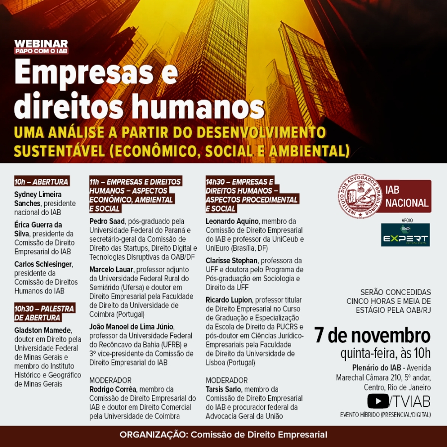 O evento contará com uma palestra de abertura conduzida pelo doutor em Direito pela Universidade Federal de Minas Gerais (UFMG) Gladston Mamede. Além disso, haverá dois painéis de debate: no primeiro deles, a relação das empresas com os direitos humanos será vista a partir dos aspectos econômico, ambiental e social; no segundo, os aspectos procedimental e social serão colocados em pauta. Os estudantes de Direito que assistirem ao webinar receberão cinco horas e meia de estágio pela OAB/RJ.