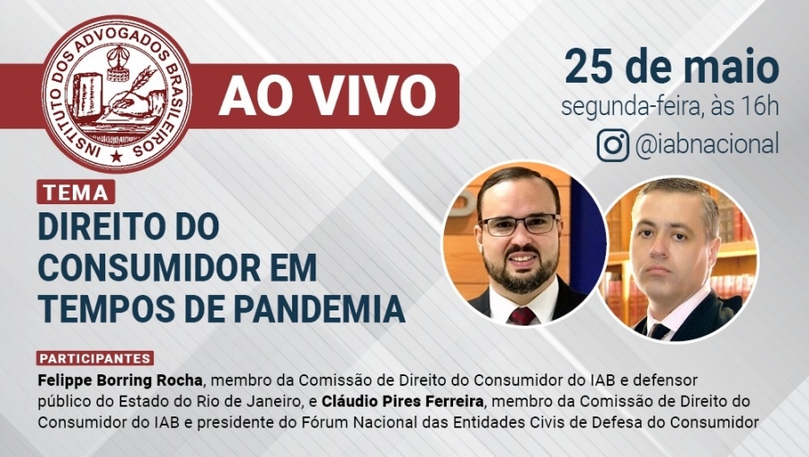 O defensor público do Estado do Rio de Janeiro Felippe Borring Rocha, membro da Comissão de Direito do Consumidor do Instituto dos Advogados Brasileiros (IAB), e o advogado Cláudio Pires Ferreira, membro da comissão e presidente do Fórum Nacional das Entidades Civis de Defesa do Consumidor, farão uma live no Instagram na próxima segunda-feira (25/5), às 16h, pelo perfil @iabnacional. A conversa será sobre ‘Direito do consumidor em tempos de pandemia’.