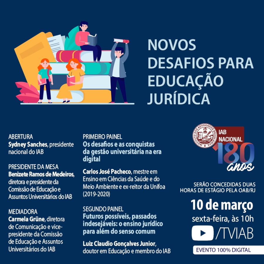 O primeiro debate, sobre Os desafios e as conquistas da gestão universitária na era digital, contará com a participação do mestre em Ensino em Ciências da Saúde e do Meio Ambiente Carlos José Pacheco; já o painel intitulado Futuros possíveis, passados indesejáveis: o ensino jurídico para além do senso comum será apresentado pelo doutor em Educação Luiz Claudio Gonçalves Junior. O evento será mediado pela diretora de Comunicação do Instituto, Carmela Grüne. Aos estudantes de Direito que assistirem ao webinar serão oferecidas duas horas de estágio pela OAB/RJ.