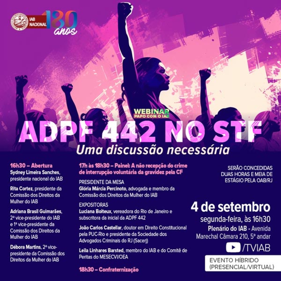 A discussão terá como tema central A não recepção do crime de interrupção voluntária da gravidez pela CF, com exposições de Luciana Boiteux, do presidente da Sociedade dos Advogados Criminais do RJ (Sacerj), João Carlos Castellar, e da membro do IAB e do Comitê de Peritas do Mesecvi/OEA Leila Linhares Barsted. A mesa de trabalhos será presidida pela advogada e membro da Comissão dos Direitos da Mulher do IAB Glória Márcia Percinoto. Os estudantes de Direito que assistirem ao webinar receberão duas horas e meia de estágio pela OAB/RJ.