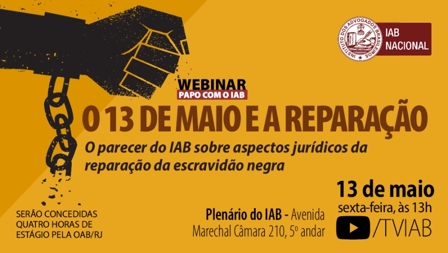 O webinar sobre O 13 de maio e a reparação será transmitido pelo canal TVIAB no YouTube e aberto pelo presidente nacional do IAB, Sydney Sanches, e pela ex-presidente Rita Cortez. Entre os palestrantes e debatedores, há advogados, acadêmicos, um magistrado e um jornalista. Aos estudantes de Direito serão concedidas quatro horas de estágio pela OAB/RJ. A sede do IAB fica na Avenida Marechal Câmara, 210, 5º andar, Centro, RJ.