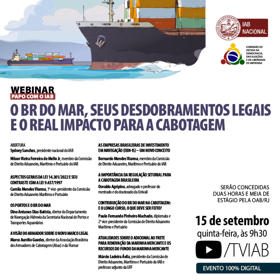 O BR do Mar é resultado de um projeto de lei do Executivo, que instituiu o Programa de Estímulo ao Transporte por Cabotagem. O programa visa a “estimular o uso da cabotagem, aumentar a frota nacional e equilibrar a matriz de transportes brasileira”. O evento será aberto pelo presidente nacional do IAB, Sydney Sanches. Aos estudantes de Direito serão concedidas duas horas e meia de estágio pela OAB/RJ.