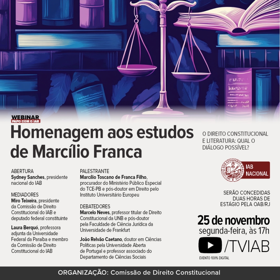 O presidente da Comissão de Direito Constitucional do IAB, Miro Teixeira, e a integrante do mesmo grupo Laura Berquó farão a mediação do evento. O debate ficará a cargo do professor titular de Direito Constitucional da Universidade de Brasília (UnB) Marcelo Neves e do doutor em Ciências Políticas pela Universidade Aberta de Portugal João Relvão Caetano. Os estudantes de Direito que assistirem ao webinar receberão duas horas de estágio pela OAB/RJ.