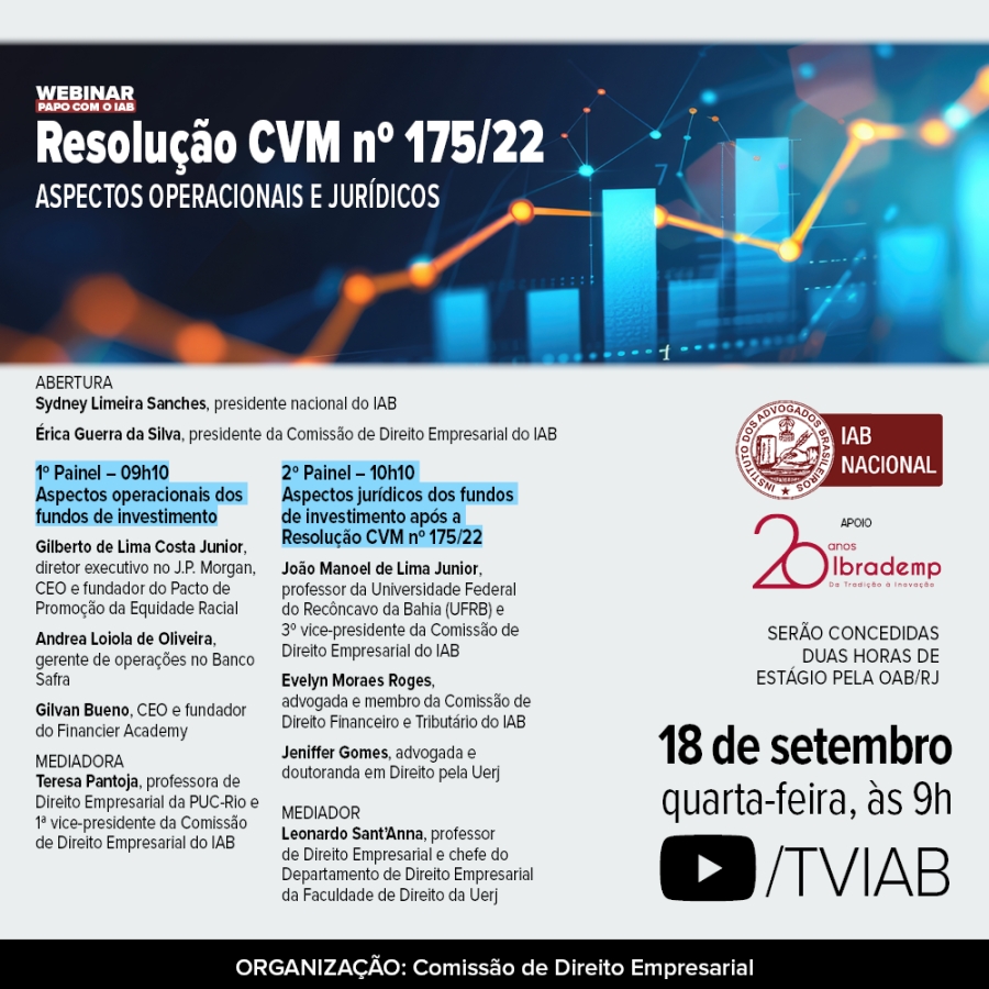 A 1ª vice-presidente da Comissão de Direito Empresarial do IAB, Teresa Pantoja, e o chefe do Departamento de Direito Empresarial da Faculdade de Direito da Uerj, Leonardo Sant’Anna farão a mediação das mesas de discussão. Os estudantes de Direito que assistirem ao webinar receberão duas horas de estágio pela OAB/RJ.