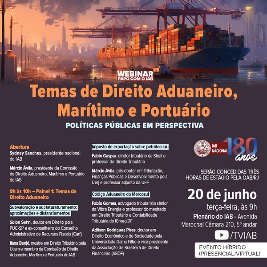 A primeira parte da palestra será finalizada pelo advogado tributarista sênior da Vibra Energia Fabio Gomes e pelo vice-presidente da Associação de Brasileira de Direito Financeiro (ABDF), Adilson Rodrigues Pires, que abordarão o tema Código Aduaneiro do Mercosul. No segundo painel, dedicado aos Temas de Direito Marítimo, o professor adjunto do Instituto Superior de Entre Douro e Vouga (Isvouga) Rui Miguel Zeferino Ferreira irá apresentar a perspectiva internacional a respeito do imposto sobre a tonelagem no debate Tonnage tax: a visão portuguesa e europeia.