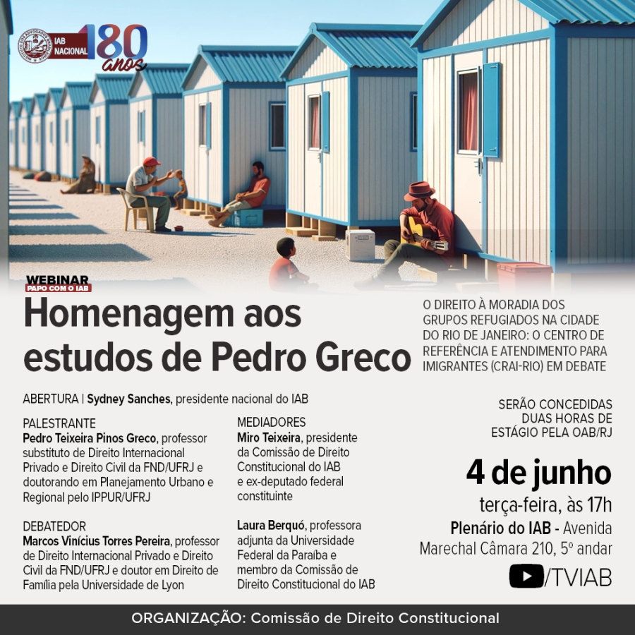 No encontro, o presidente e a membro da Comissão de Direito Constitucional do IAB, Miro Teixeira e Laura Berquó, respectivamente, farão a mediação da discussão, que terá o professor de Direito Internacional Privado e Direito Civil da Faculdade Nacional de Direito (FND) da UFRJ Marcos Vinícius Torres Pereira como debatedor. Os estudantes de Direito que assistirem ao webinar receberão duas horas de estágio pela OAB/RJ.