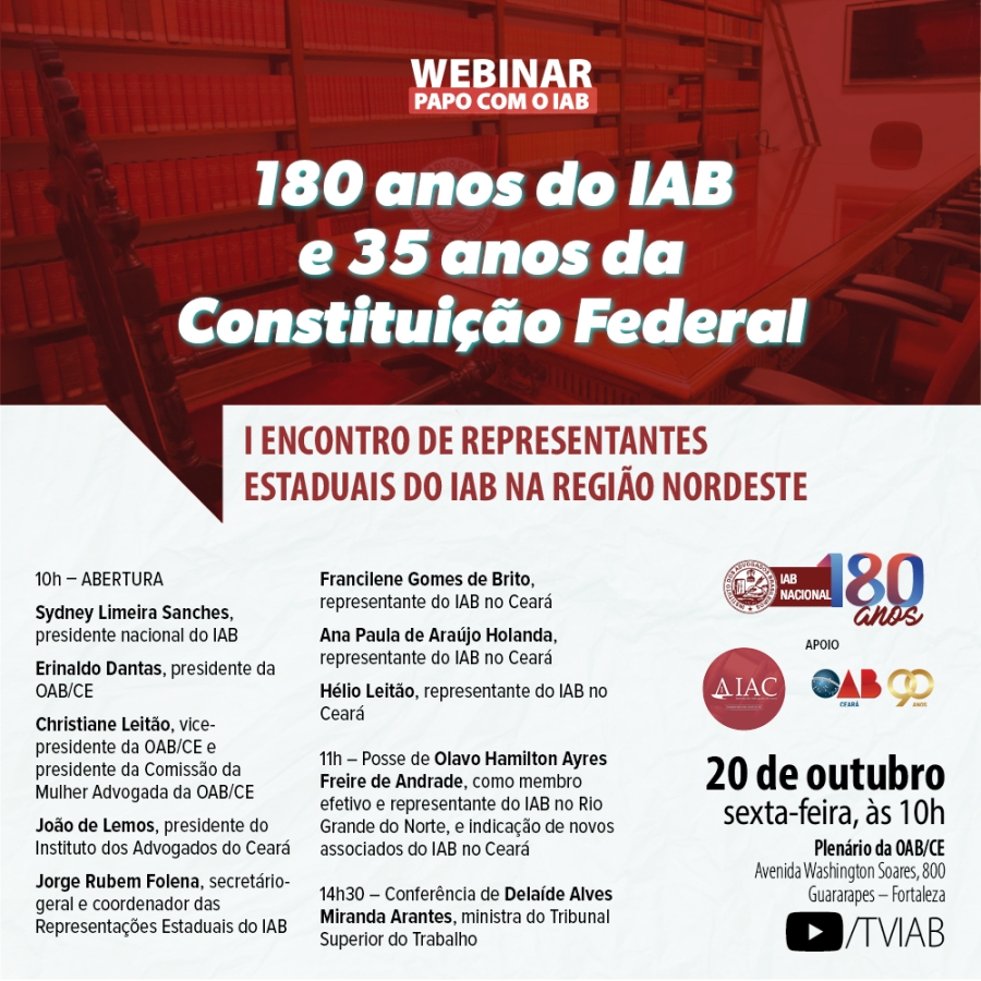 O encontro também contará com conferência da ministra do Tribunal Superior do Trabalho (TST) Delaíde Alves Miranda Arantes e palestras dos representantes estaduais do IAB em Pernambuco, Fábio Túlio Barroso, em Sergipe, Sandro Mezzarano, na Paraíba, Carlos Aquino, e do Piauí, Álvaro Mota. A evolução dos direitos trabalhistas nos 35 anos da Constituição e O IAB na vanguarda dos direitos sociais serão temas abordados por Túlio Barroso. O painel Os 180 anos do IAB e a educação jurídica terá apresentação de Ana Paula Araújo Holanda e o debate sobre o aniversário quase bicentenário da entidade será debatido por Carlos Aquino.